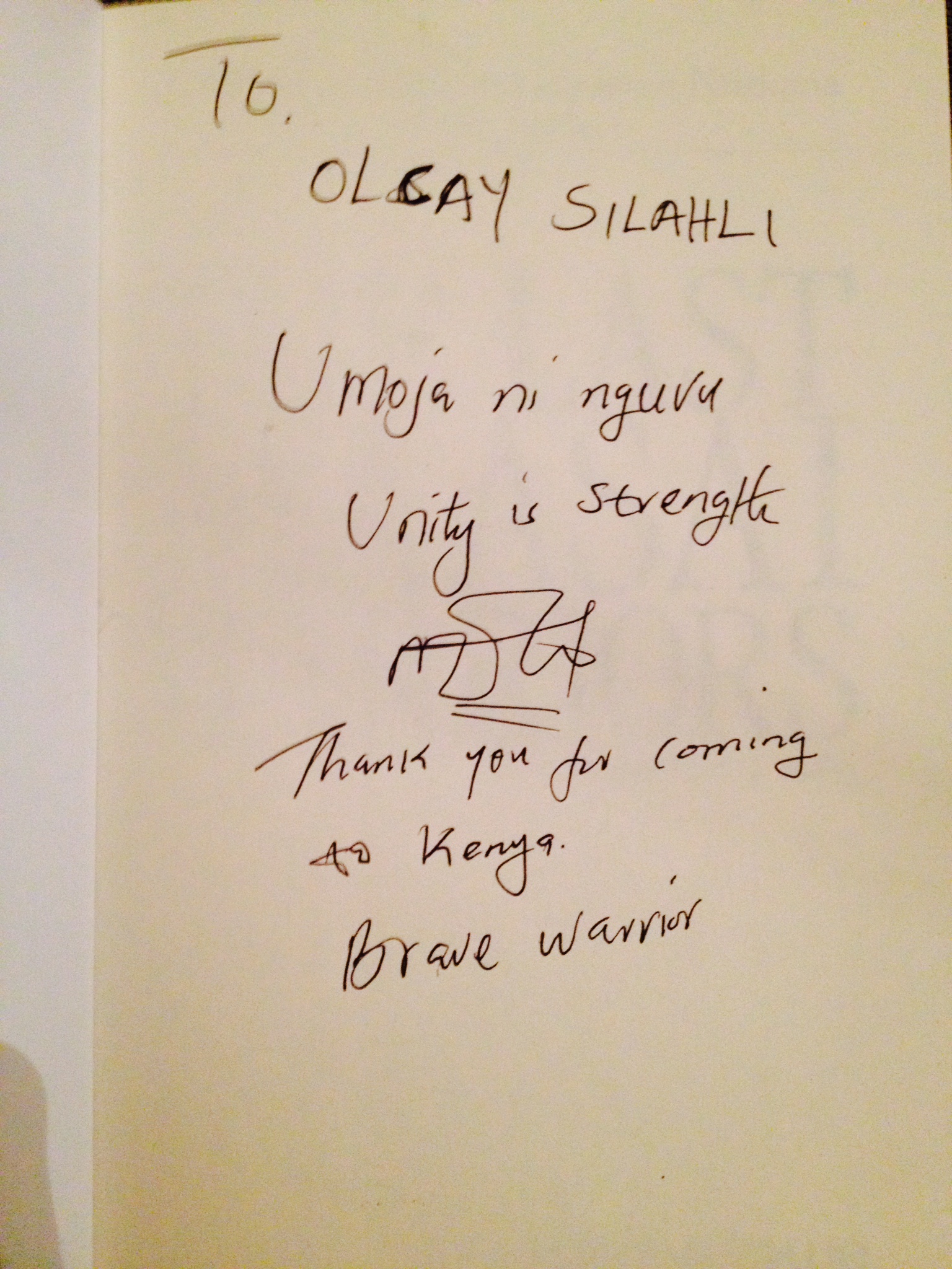 “The Last Maasi Mara Warriors” adlı kitabını imzalayarak bana verdi ve ben de gururla bu sayfanın resmini sizinle paylaşıyorum.